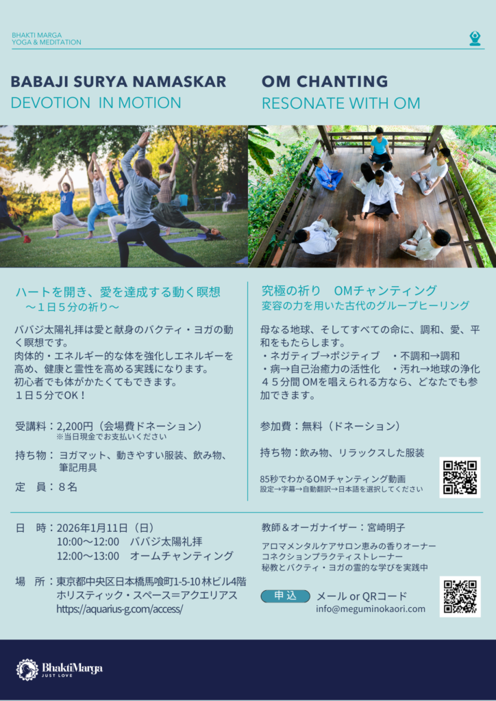 【開催のご案内】1/11(日)ババジ太陽礼拝&オームチャンティング(東京都中央区日本橋)