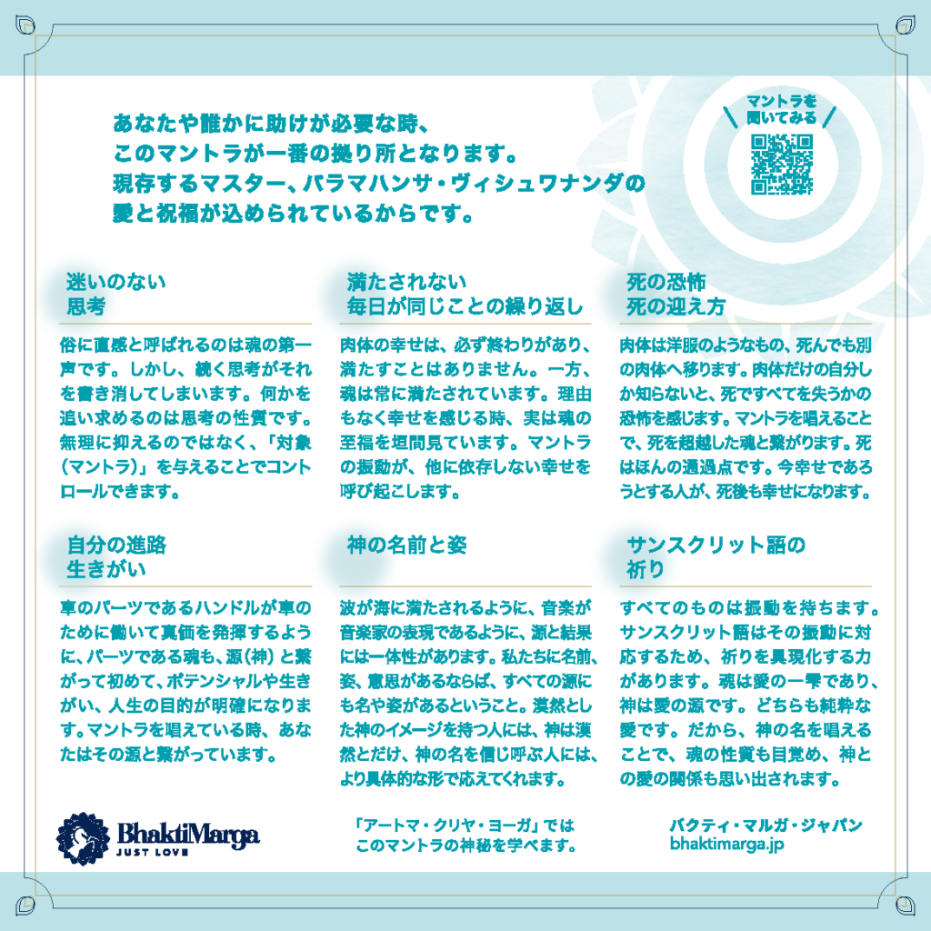 マントラの意味は、「私の内にも外にも偏在するすべての友であり、すべてを守る神よ、あなたの名を呼びます」です。